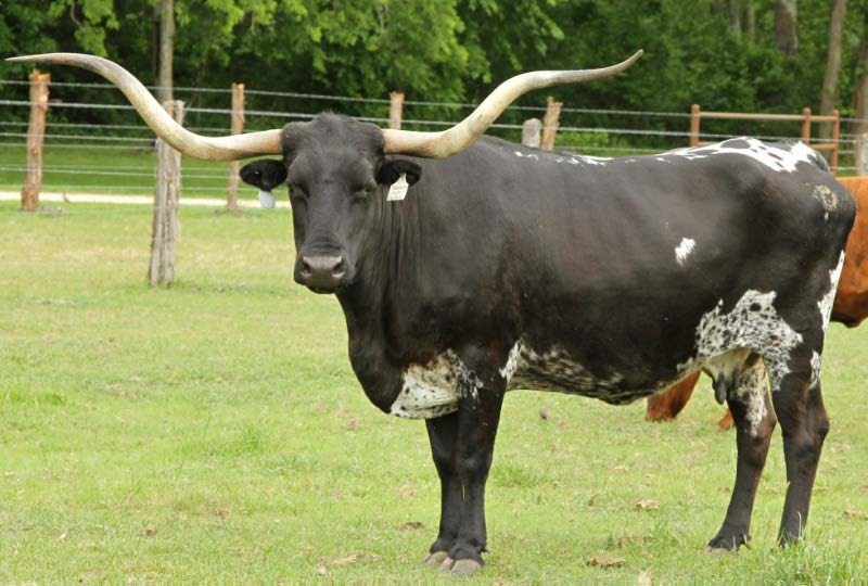 This big, black and white cow is a real standout. Her triple twisty horns are over 78"TTT and 93" of total horn.Her calves are great and she produces a lot of heifers. Her entire pedigree are big horned longhorns.